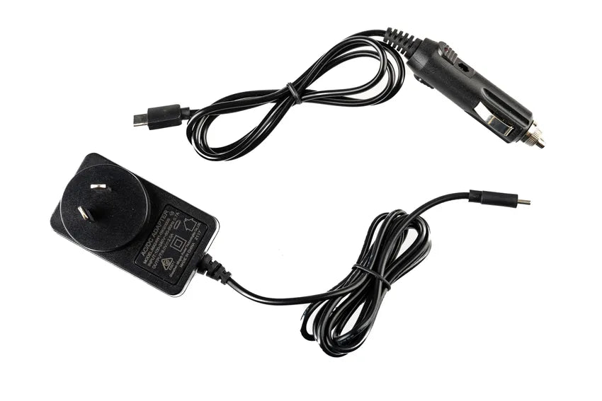 The Adventure Kings 1000A Jumpstarter comes with both 12v and 240v chargers, as well as a multi-head charging cable with micro USB, mini USB, USB C and Lightning connectors.